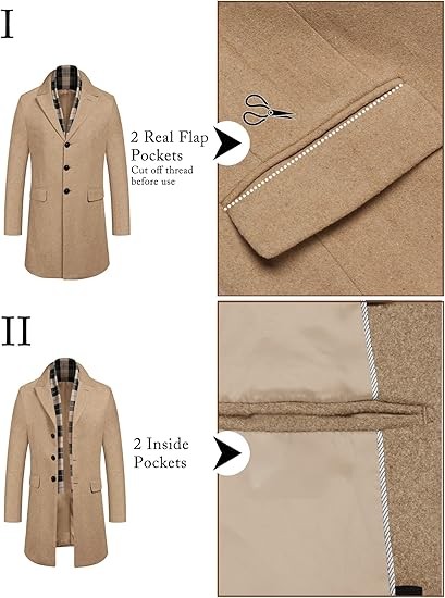 COOFANDY Men's Wool Blend Coat with Detachable Plaid Scarfs Notched Collar Single Breasted Pea Coat Trench Overcoat