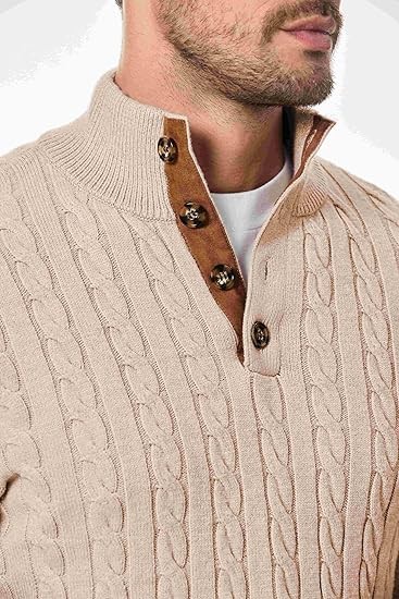 Unique Design: Casual sweater for men features button-up neck, stand collar, chunky warm, basic simple design. The collar and elbows are accented with suede patches, and it includes high-quality button closures.