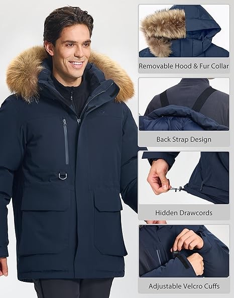 • Functional Details: Detachable hood and faux fur trim of men’s winter jacket offer 2 wearing styles. Adjustable hood fits various head shapes, reduces wind entry without blocking vision. Adjustable Velcro cuffs with inner elastic gaiters seal out wind. Hidden hem drawcord prevents cold air from entering. Water-resistant zippered pockets provide secure, weather-protected storage.